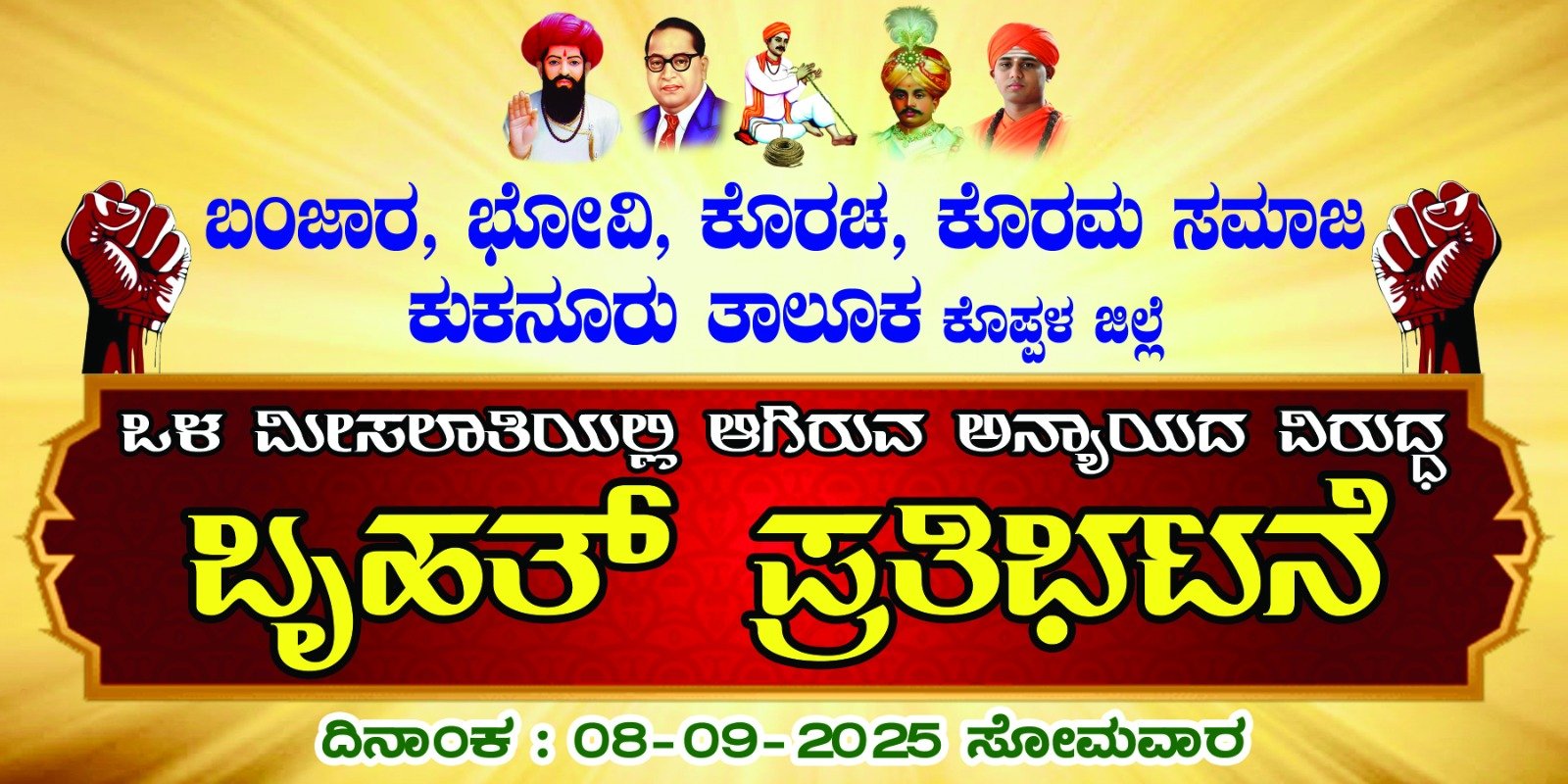 ಕುಕನೂರು : ಬಂಜಾರ ಭೋವಿ, ಕೊರಮ ಕೊರಚ ಸಮುದಾಯಗಳಿಗೆ ಒಳ ಮೀಸಲಾತಿಯಲ್ಲಿ ಕರ್ನಾಟಕ ಸರ್ಕಾರ ಮಾಡಿರುವ ಅನ್ಯಾಯದ ವಿರುದ್ಧ ಇದೇ ಸಪ್ಟೆಂಬರ್ 8 ರಂದು ಸೋಮವಾರ ಕೂಕನೂರು ಪಟ್ಟಣದಲ್ಲಿ ಬೃಹತ್ ಪ್ರತಿಭಟನೆ ನಡೆಸಲಿದ್ದೇವೆ ಎಂದು ಬಂಜಾರ ಸಮಾಜದ ಮುಖಂಡರು ಪ್ರಕಟಣೆಯಲ್ಲಿ ತಿಳಿಸಿದ್ದಾರೆ.