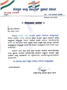 ಇಂದು ರಾಜ್ಯ ಕಾಂಗ್ರೆಸ್ ಪ್ರಚಾರ ಸಮಿತಿಯ ಅಧ್ಯಕ್ಷ ವಿನಯ್ ಕುಮಾರ್ ಸೊರಕೆ ಅವರು ಆದೇಶದ ಮೇರೆಗೆ ಜಿಲ್ಲಾ ಕಾಂಗ್ರೆಸ್ ಅಧ್ಯಕ್ಷ ಅಮರೇಗೌಡ ಬಯ್ಯಾಪರವರು ಕಾರ್ತಿಕ್ ಜಾದವ್ ಹಾಗೂ ರಫಿ ಹಿರೇಹಾಳ ಅವರನ್ನು ಕಾಂಗ್ರೆಸ್ ಪಕ್ಷದ ಪ್ರಚಾರ ಹಾಗೂ ಸಂಘಟನೆಯ ಬಲವರ್ಧನೆಗಾಗಿ ನೇಮಕಾತಿ ಮಾಡಲಾಗಿದೆ ಎಂದು ತಿಳಿಸಿದ್ದಾರೆ.