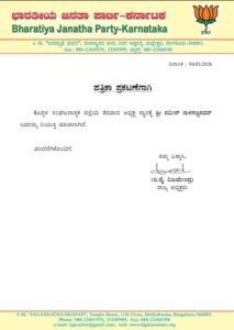 ಈ ಕುರಿತು ಪಕ್ಷದ ರಾಜ್ಯಾಧ್ಯಕ್ಷ ಬಿ.ವೈ. ವಿಜಯೇಂದ್ರ ಅವರು ಪ್ರಕಟಣೆ ಹೊರಡಿಸಿದ್ದು, ತಕ್ಷಣದಿಂದಲೇ ಈ ನೇಮಕ ಜಾರಿಗೆ ಬರುವಂತೆ ತಿಳಿಸಿದ್ದಾರೆ.