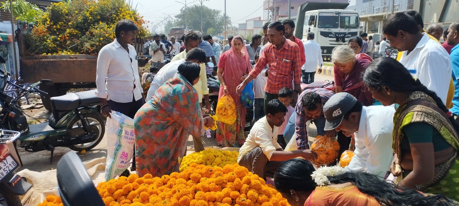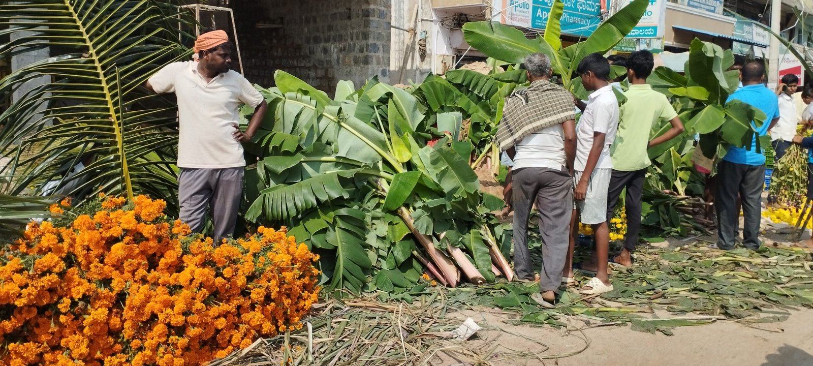 ಚಂಡು ಹೂವು, ಬಾಳೆ ಕಂಬ, ಸೇವಂತಿ, ಕಬ್ಬು, ಕುಂಬಳ ಕಾಯಿ ಭರ್ಜರಿ ಖರೀದಿಯಲ್ಲಿ ಗ್ರಾಹಕರು ತೊಡಗಿದ್ದು ಕಂಡುಬಂದಿತು. ಬರಗಾಲದ ನಡುವೆಯು ಹಬ್ಬದ ಸಂಭ್ರಮ ಮನೆ ಮಾಡಿದ್ದರೆ . ಬೆಲೆ ಏರಿಕೆಯ ಬಿಸಿ ಗ್ರಹಕರನ್ನು ಕಂಗೆಡಿಸಿದೆ.